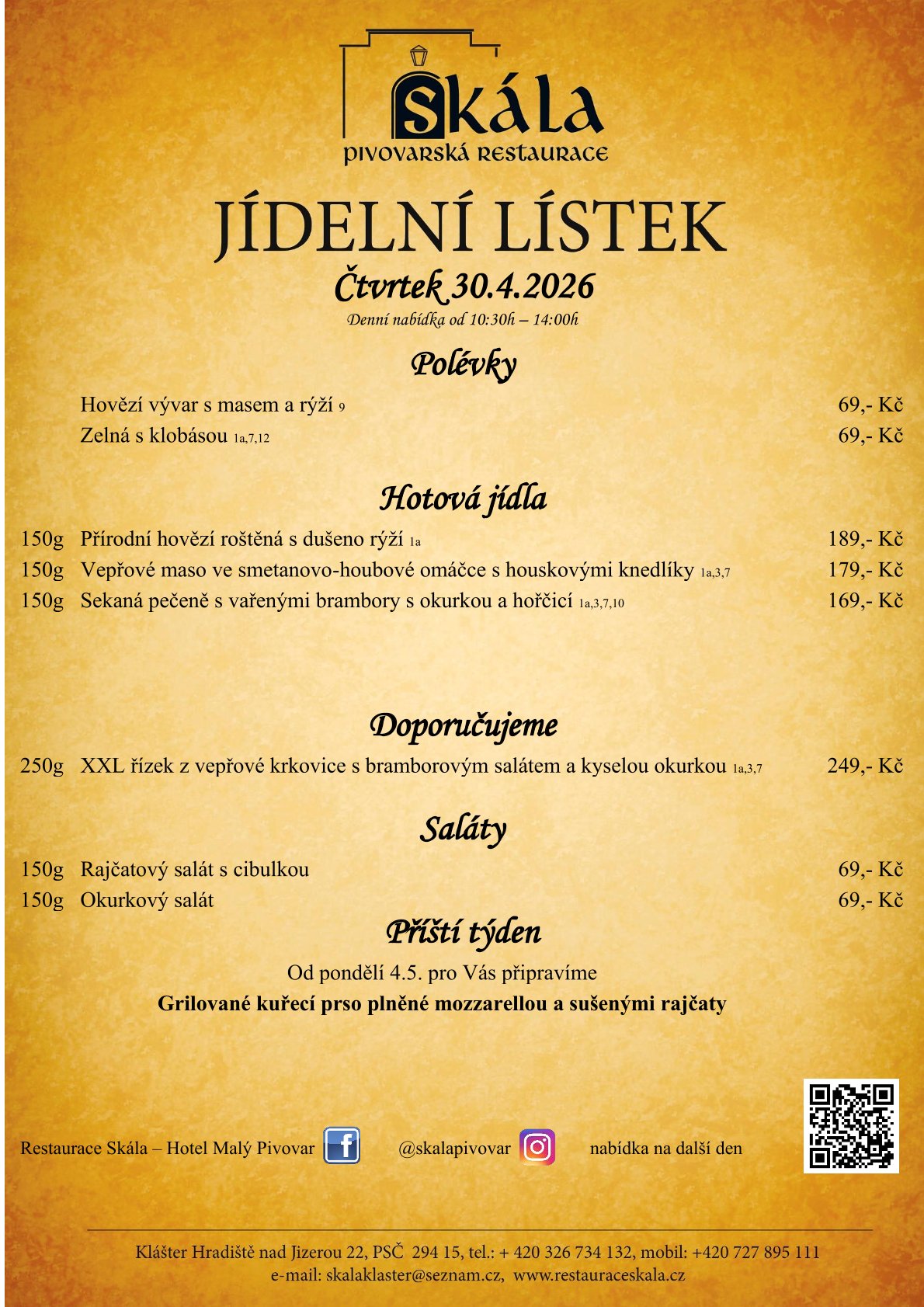 Krom stálé nabídky jídel nabízí Restaurace Skála také denní menu, které podává každý všední den od 10:30 do 14:00.