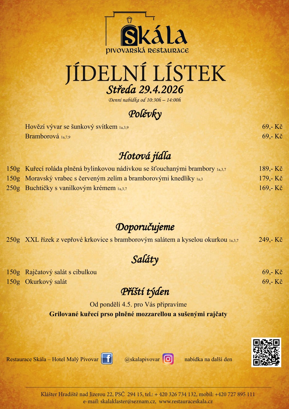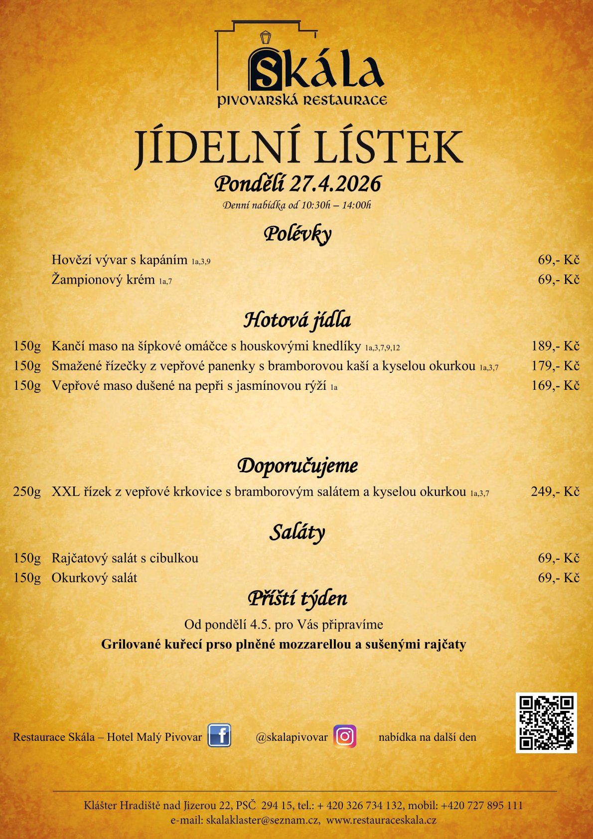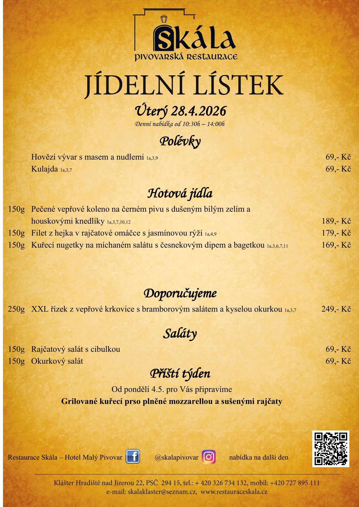 Krom stálé nabídky jídel nabízí Restaurace Skála také denní menu, které podává každý všední den od 10:30 do 14:00.